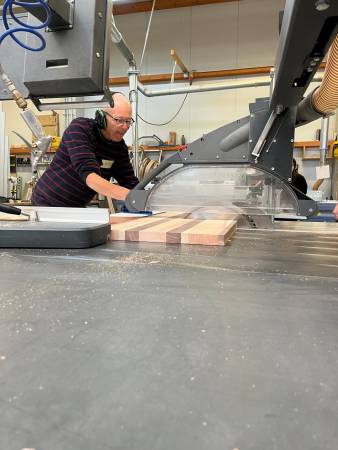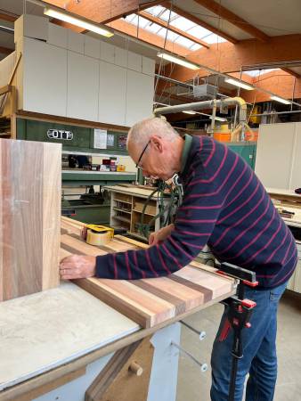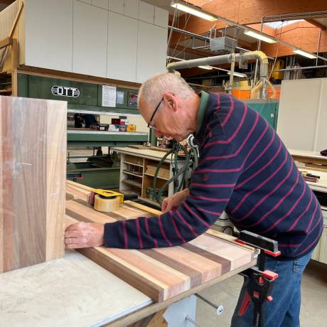 Nach dem Verleimen der ersten Teile – mit tatkräftiger Unterstützung durch die Klemmen – ging es in eine wohlverdiente Frühstückspause mit frischem Brot, Schinken und Käse vom Münsteraner Wochenmarkt. Gestärkt arbeiteten wir weiter: schleifen, sägen, auf Gehrung schneiden und schließlich alle Einzelteile zum fertigen Hocker zusammensetzen.
