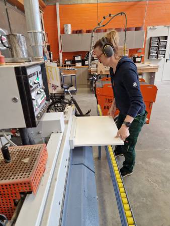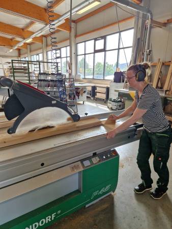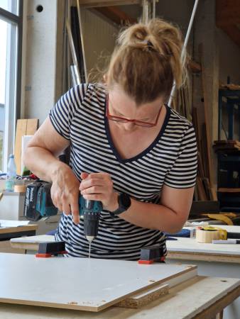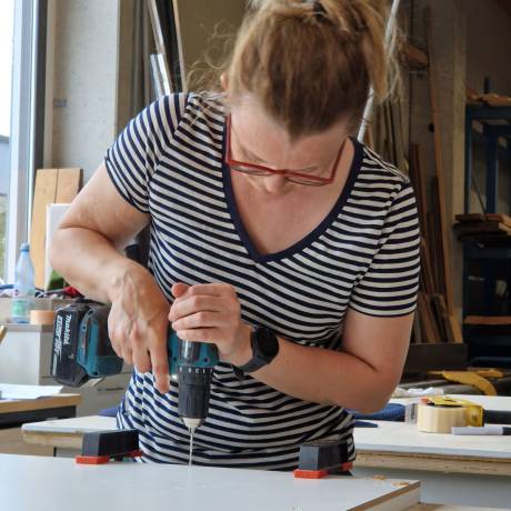 Dein ganzes Arbeitszimmer mit dem Tischler* planen und selber bauen, mit Linoleum Arbeitsplatte in dreieinhalb Meter Länge, ultra-matten weißen völlig unempfindlichen Fronten, mit Regalen kombiniert aus coolem Weiß und massiver Eiche und dann noch einem mobilen Container der bis in Dein Wohnzimmer multifunktional zum Einsatz kommt … das kannst Du doch nur geträumt haben! Weit gefehlt! Anja wäre keine erfolgreiche Managerin gewesen, wenn sie für diesen Traum keine Lösung gefunden hätte. Im individuellen Tischler* Workshop konnte Anja ohne Vorkenntnisse in 10 Tagen alle Arbeitsschritte, vom Zuschnitt der rohen Eichenbohlen, Hobeln, Fräsen, Bohren, Verbinden bis zum Schleifen und Ölen der massiven Teile erlernen und umsetzten. Anja hatte totalen Spaß und fühlte sich im laufenden Tischlerei Betrieb sicher manchmal wie live in der Sendung mit der Maus. Das Ergebnis ist ein perfektes Arbeitszimmer welches keine Wünsche offen lässt … und der nächste Traum, das eigene, selbst getischlerte Badmöbel ist schon geplant!