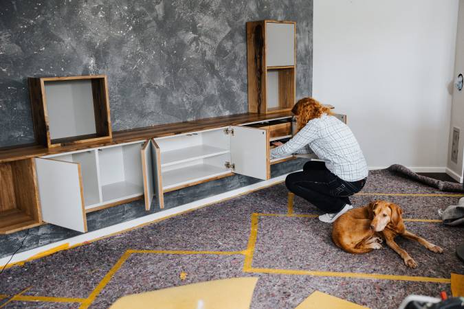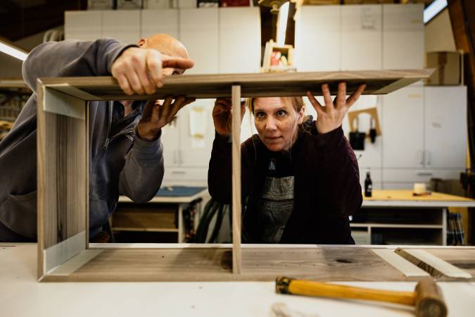 Immer wieder biete ich Einzelworkshops an, bei denen ich gemeinsam mit meinen Kunden Möbel baue. In diesem Fall haben Jessica und ich eine Wohnzimmerwand für sie entworfen und anschließend auch gebaut. Das sollte jedoch nicht unser einziges gemeinsames Projekt bleiben – wir haben außerdem einen neuen Garderobenschrank gefertigt.