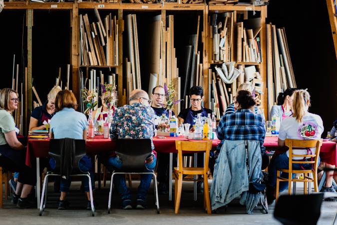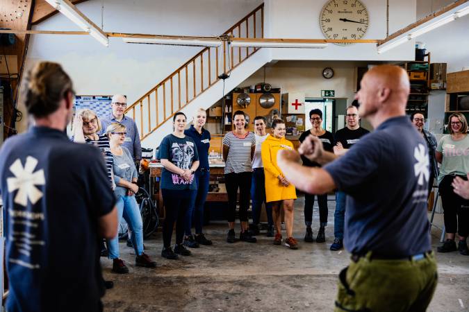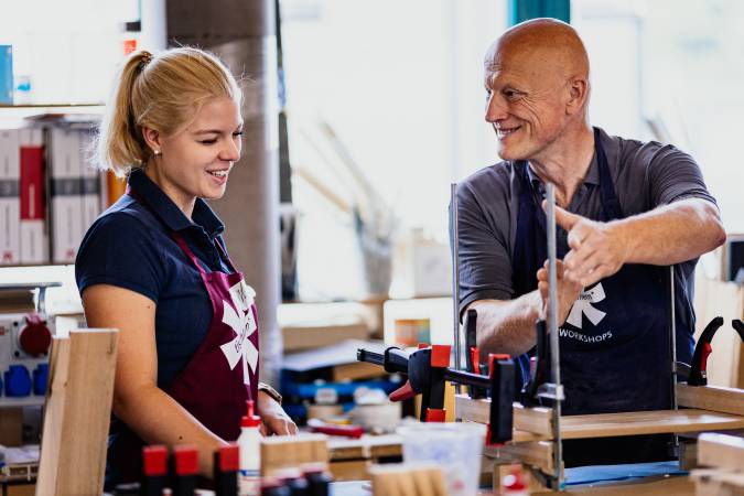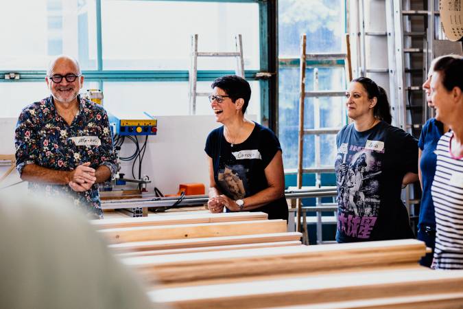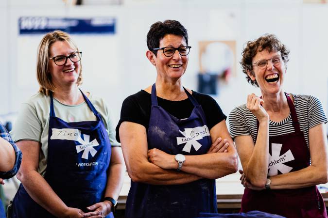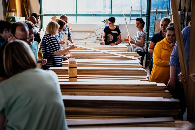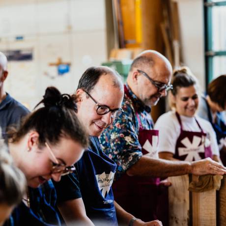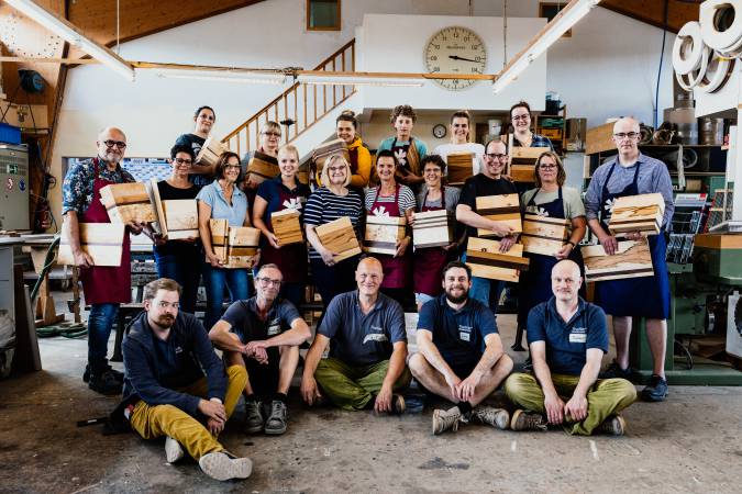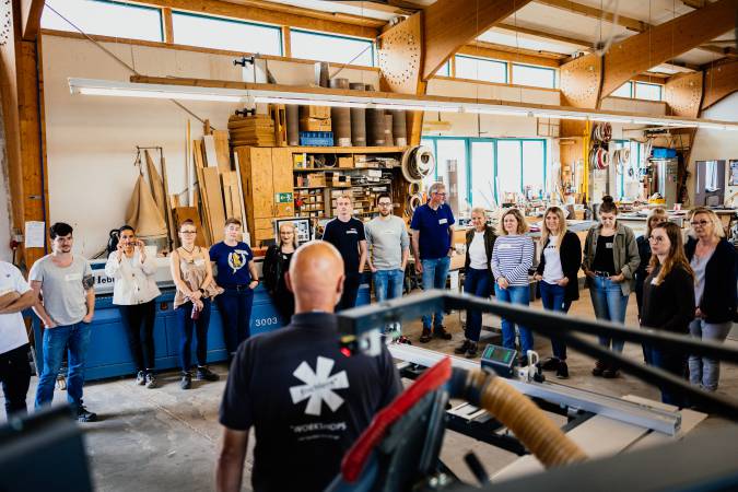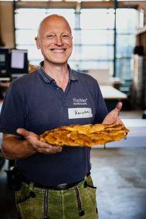 „Besser geht es nicht“ war der Kommentar von Markus Lentschig nach seinem ersten Praxis-Team-Tischler-Event in meiner Werkstatt, das nun schon sicher sechs Jahre her ist. Dabei begann alles bereits zwei Jahre vorher. Markus hatte seinem Sohn einen gemeinsamen Workshop-Tag zu Weihnachten geschenkt und fragte mich in der Frühstückspause ganz locker, ob ich so einen Workshop auch mit 35 Teilnehmern, also seinem Team, ausrichten könne. Mir blieb das Herz stehen. Ich konnte nur sagen, dass das natürlich möglich sei, während ich gleichzeitig fieberhaft nach einer Lösung suchte. 35 Leute auf einen Schlag sind nämlich eigentlich völlig unmöglich! Der Geistesblitz kam, als ich die Gruppe teilte: 17 Personen könnten besonders große Schneidebretter bauen, diese teilen und abends, ganz im Sinne der Teambildung, jeweils einem Kollegen eines ihrer Bretter überreichen. Die „Beschenkten“ würden sich durch ein mehrgängiges Menü, das im Rahmen eines Team-Koch-Events nach einem morgendlichen Bummel über den münsteraner Wochenmarkt zubereitet wurde, revanchieren. Tolle Idee, dachte ich, aber Markus fand, dass Bretter teilen blöd sei. „Wir tauschen einfach am zweiten Tag die Gruppen!“ Was für ein Chef!