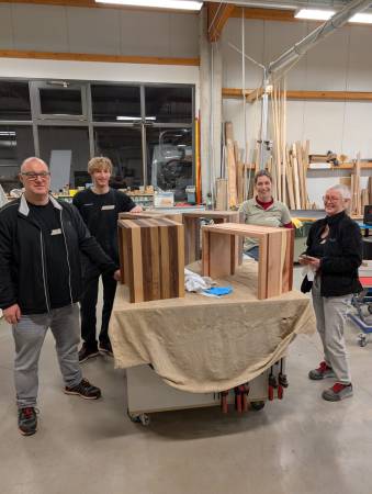 Nach der Pause ging es dann an die Säge. Wir schnitten unser langes Brett in die gewünschten Maße, und es war beeindruckend zu sehen, wie aus einem einfachen Stück Holz ein Hocker entstehen sollte. Die Herausforderung bestand darin, die Teile so zuzuschneiden, dass sie später perfekt zusammenpassten. Es war ein bisschen knifflig, aber mit Karstens Unterstützung meisterten wir diese Aufgabe mit Bravour.