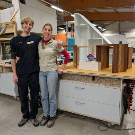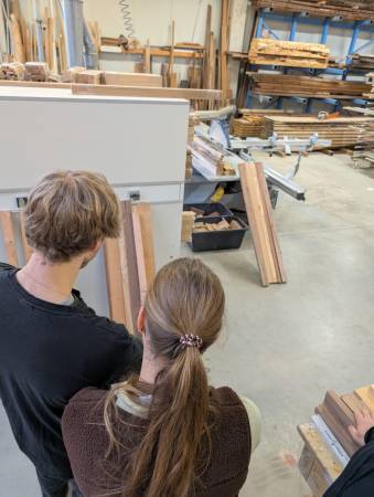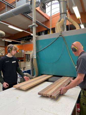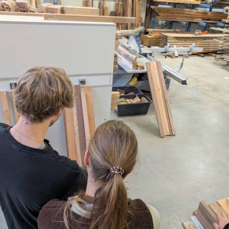 Gemeinsam mit zwei anderen Teilnehmern wählten wir unser Holz aus und begannen mit dem Verleimen. Es war spannend zu sehen, wie aus den einzelnen Holzstücken allmählich die Grundlage für unseren Hocker entstand. Während der ersten Schritte des Workshops war die Aufregung spürbar, und wir konnten es kaum erwarten, mit dem Sägen und Formen zu beginnen, mussten uns aber noch ein wenig gedulden, bis der Leim getrocknet war.