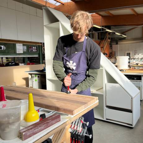 Zum Schluss mussten alle Teile noch gründlich geschliffen und geölt werden, um dem Hocker den letzten Schliff zu verleihen.